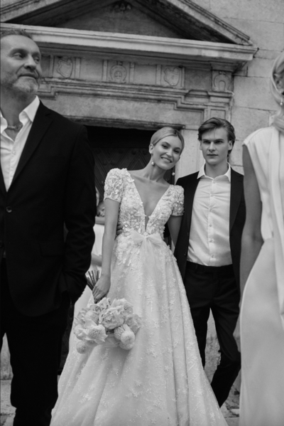 A-line wedding dress featuring a corset bodice that is embellished with beaded 3D floral motifs. These details continue throughout the entire glitter tulle, soft tulle, and organza skirt
