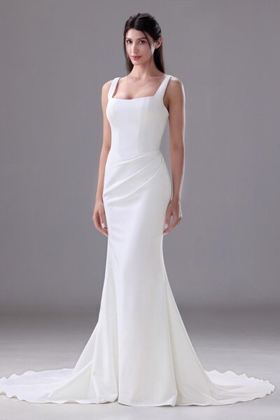A elegant Matte Charmeuse Fit and Flare gown with a V-neckline and soft gathers that criss cross at the bodice.