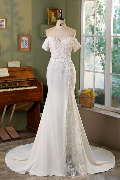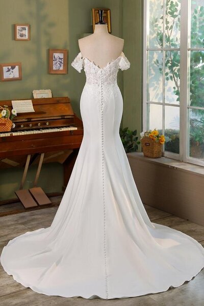 Alluring Off The Shoulder Sleeve Lace Fit-and-Flare Wedding Dress With Open Back