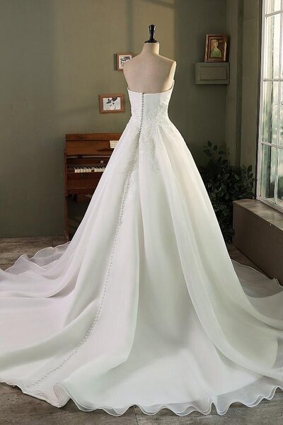 Strapless princess gown with floral lace sweetheart bodice, low back, airy a-line tulle skirt and a chapel length train.