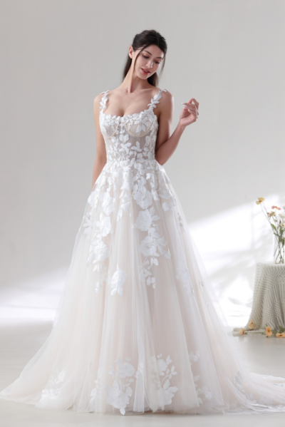 A-line gown with delicate floral lace bodice, illusion straps, a small plunge at the V-neckline and open back.